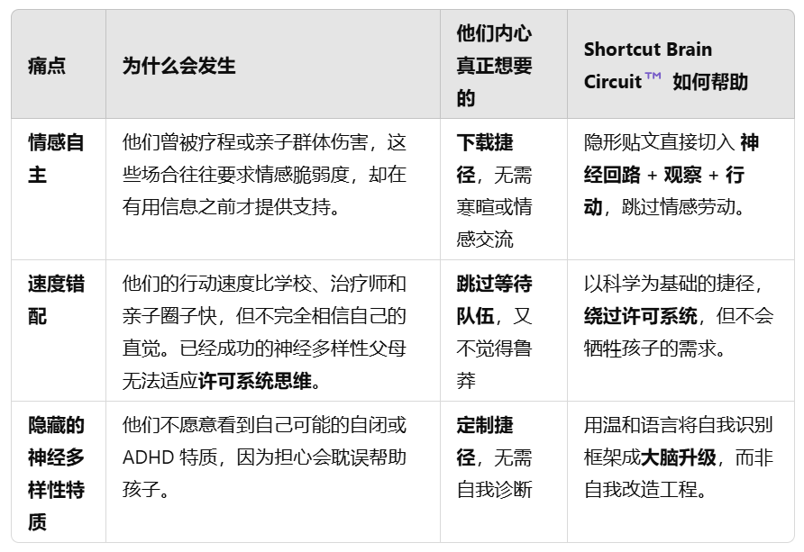 你来对地方了吗?给不想解释自己的父母shortcut brain circuitMar 06, 2025Share给比系统运转更快的父母——但不把速度当成敌人。拥有神经多样性孩子的成功父母——尤其是千禧世代的职业父母——经常把痛点隐藏在能力背后。他们已经读过所有资料。他们不需要更多信息——他们需要能跳过慢速情感工作的捷径,因为现有系统只保护所有人的感受,却忽视了他们。Shortcut Brain Circuit™️ 并不想修理任何人。它是为了那些想要绕过缓慢系统,却不想在过程中迷失自我的父母而建立。没有社群。没有情感劳动。只有有效的捷径。
